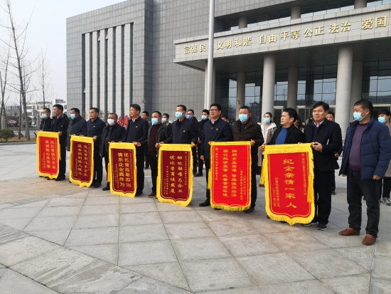2月4日下午,淮陽區(qū)康森木業(yè)有限公司、周口裕彩科技研發(fā)有限公司等6家企業(yè)代表為區(qū)優(yōu)化營商環(huán)境專項(xiàng)治理工作組送來了6面錦旗和大量防疫物資,向工作組表達(dá)感激之情,對工作組人員高效快捷的工作給予高度贊揚(yáng)。