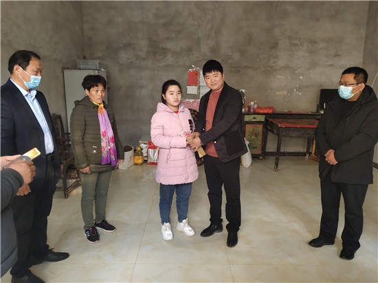 “你要好好學(xué)習(xí),勇敢堅(jiān)強(qiáng),樂(lè)觀面對(duì)生活,有困難我們會(huì)盡力幫助你!”2月7日,在鄲城縣汲水鄉(xiāng)張嶺村,該鄉(xiāng)副鄉(xiāng)長(zhǎng)楊衛(wèi)杰、愛(ài)心人士魏昌宏、汲水二中校長(zhǎng)陳法杰把2000元錢(qián)和棉襖、米面油等生活用品送到建檔立卡貧困戶學(xué)生張慧敏手中,為她送去特別的關(guān)懷和溫暖。