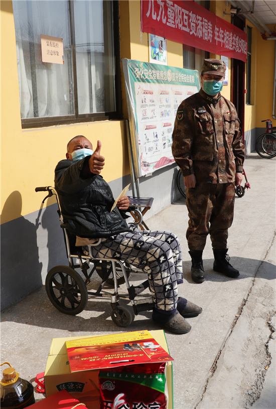新橋鎮(zhèn)新兵楊凱入伍前和癱瘓的父親相依為命,市人武部領(lǐng)導(dǎo)協(xié)調(diào)地方政府,把其父親送到了新橋鎮(zhèn)敬老院公費(fèi)養(yǎng)老,解除他的后顧之憂。春節(jié)到了,人武部領(lǐng)導(dǎo)還牽掛著這個(gè)特困家庭,矯百成帶隊(duì)來到新橋鎮(zhèn)敬老院。此時(shí)正值中午,楊凱的父親正坐在屋外的輪椅上曬太陽,見到矯部長的突然到來,激動的眼含熱淚,他緊緊握住矯百成的手久久不愿松開。矯百成噓寒問暖,給他送上1000元慰問金和生活必需品,楊凱的父親用他那不太清晰的語言表達(dá)對部長的真誠感謝。在敬老院院長的帶領(lǐng)下,矯百成又來到老人的住室察看起居情況,詢問他平時(shí)生活狀況,當(dāng)?shù)弥先松畹暮苁娣r(shí),矯百成滿意的笑了。