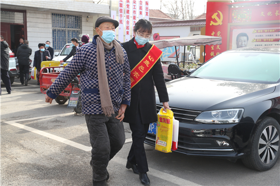 在鄭家集鄉(xiāng)韓樓村,縣農(nóng)商銀行鄭家集支行行長(zhǎng)武繼龍帶領(lǐng)員工來(lái)到92歲韓老漢的家中,看到韓老漢由于身體原因只能靠拐棍佝僂著背站著,武繼龍緊忙彎腰俯下身說(shuō):“大爺,快過(guò)年了,我們來(lái)看看您,提前給您拜個(gè)早年!”“真的是太感謝恁了,這么冷的天,還讓你們來(lái)送到家里面?!表n老漢激動(dòng)地說(shuō)。
