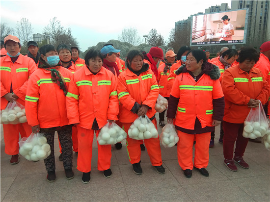 當日下午5時許,胡環(huán)等30余名環(huán)衛(wèi)工人來到川匯區(qū)政府廣場,周口市家庭教育學會工作人員依次向他們發(fā)放裝好的過年饅頭,領取過年饅頭后的環(huán)衛(wèi)工人臉上樂開了花。