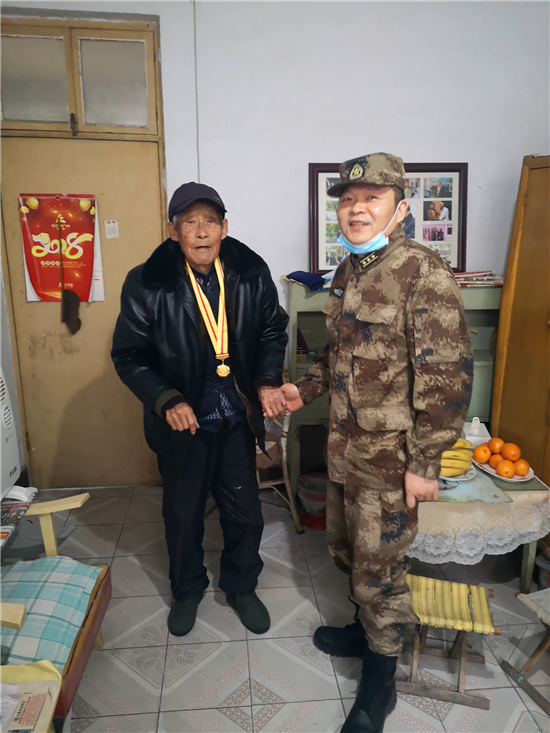 “向您拜年,您是革命軍人、退伍老兵的楷模,也是我們所有軍人學(xué)習(xí)的榜樣?!睆堄戮o緊拉著老人的手說??吹浇夥跑姽俦鴣砜赐约?,老人連連致謝,“沒有共產(chǎn)黨就沒有今天的美好生活!感謝黨,讓我們吃飽穿暖過上幸福生活。感謝人民解放軍,多年如一日,始終記掛著我這一名老兵。“
