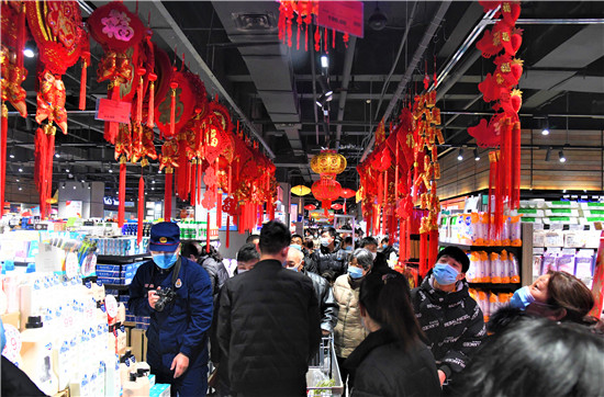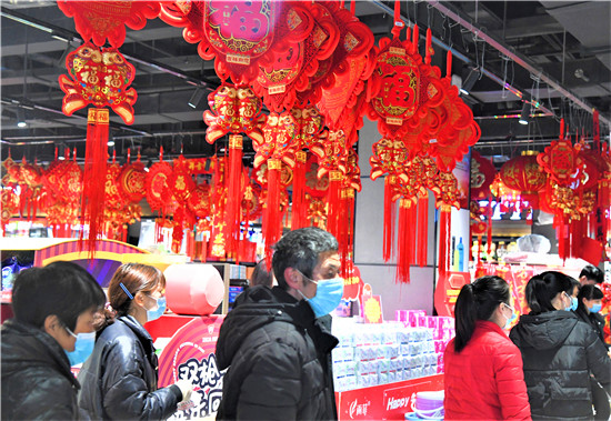 2月9日上午,商水縣行政路一大型超市內年貨充足,人流如織,市民自覺佩戴口罩進入商場“掃貨”。