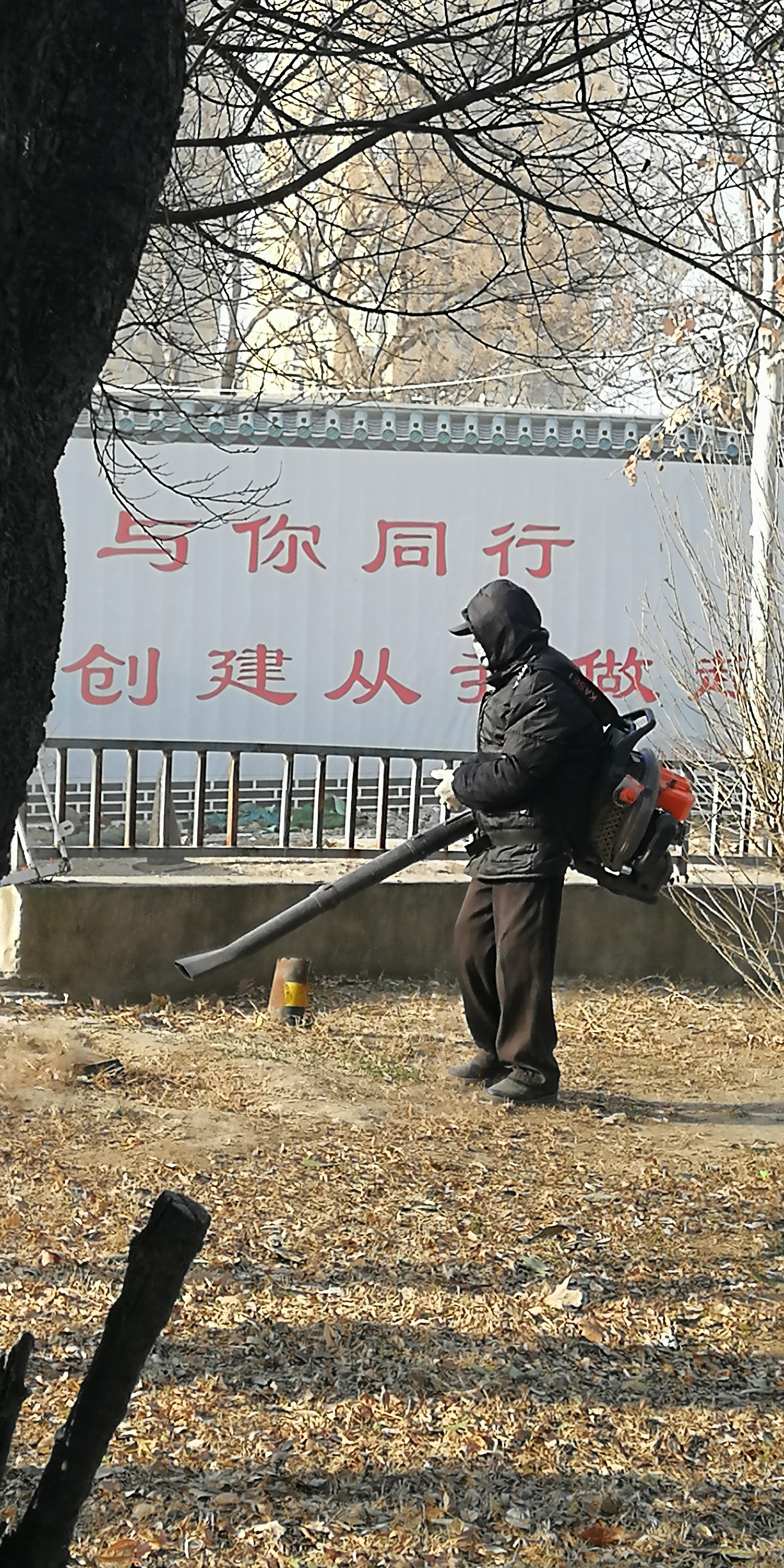 2月11日,大年三十。在川匯區(qū)濱河路上,工作人員背著吹風(fēng)機(jī)清理游園內(nèi)的落葉和垃圾。工作人員介紹,這樣便于更快更好地工作。(周口日?qǐng)?bào)·周道客戶端記者 馬月紅)②7