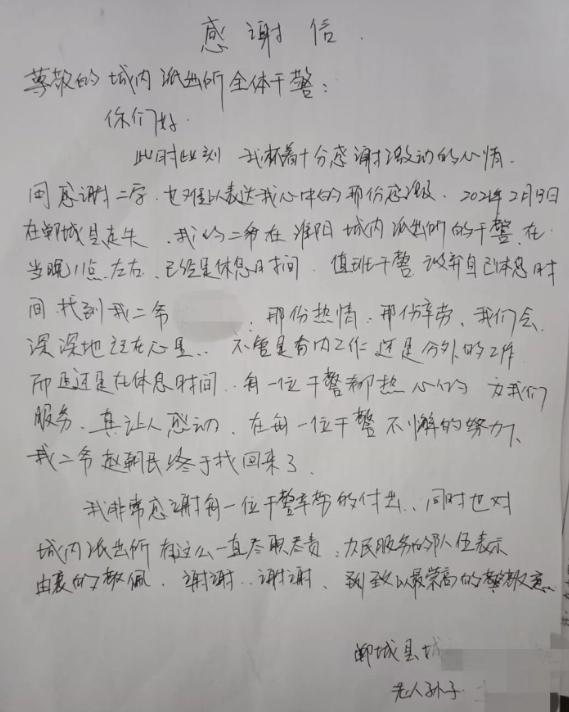 家屬告訴民警,老人去年剛做完手術(shù),身體存在一點問題。民警告知老人家屬今后要看管好老人,謹防走失,并為老人建立易走失人員檔案,以備兄弟單位使用,老人家屬對城內(nèi)派出所表示感謝并寫了一封感謝信。