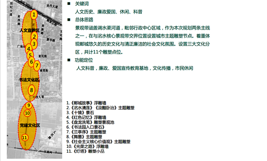 調(diào)水渠景觀在洺河生態(tài)水系“五帶五園一環(huán)多點(diǎn)”景觀中被稱為“人文歷史帶”。全程以“水脈、文脈、人脈”為核心,以“綠色、生態(tài)、休閑、文化”為理念,建設(shè)了“三段銜一園”的景觀結(jié)構(gòu),有鄲淮路至廣場(chǎng)南路的景觀核心形象段、廣場(chǎng)南路以南至科技大道的書法體驗(yàn)段、科技大道以南至五里河的教育文化段和位于交通路與英博路之間的書法生態(tài)休閑園。全段景觀以人文歷史為主題,分別設(shè)置了文化廣場(chǎng)、汲黯廣場(chǎng)、廉政廣場(chǎng)、書林步道、墨香廣場(chǎng)、歷史長(zhǎng)廊、書法公園等19處景觀節(jié)點(diǎn)。