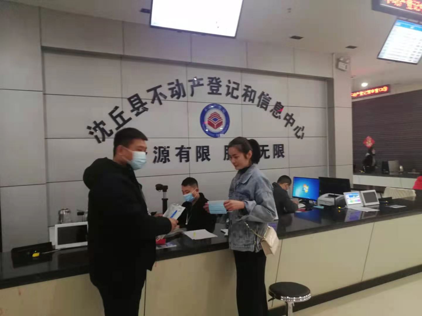 “您好,給您一個口罩,麻煩戴上吧!”2月20日,在沈丘縣不動產登記和信息中心辦理大廳,工作人員向前來辦理業(yè)務的群眾及時發(fā)放口罩,提醒大家要隨時做好自我防護。