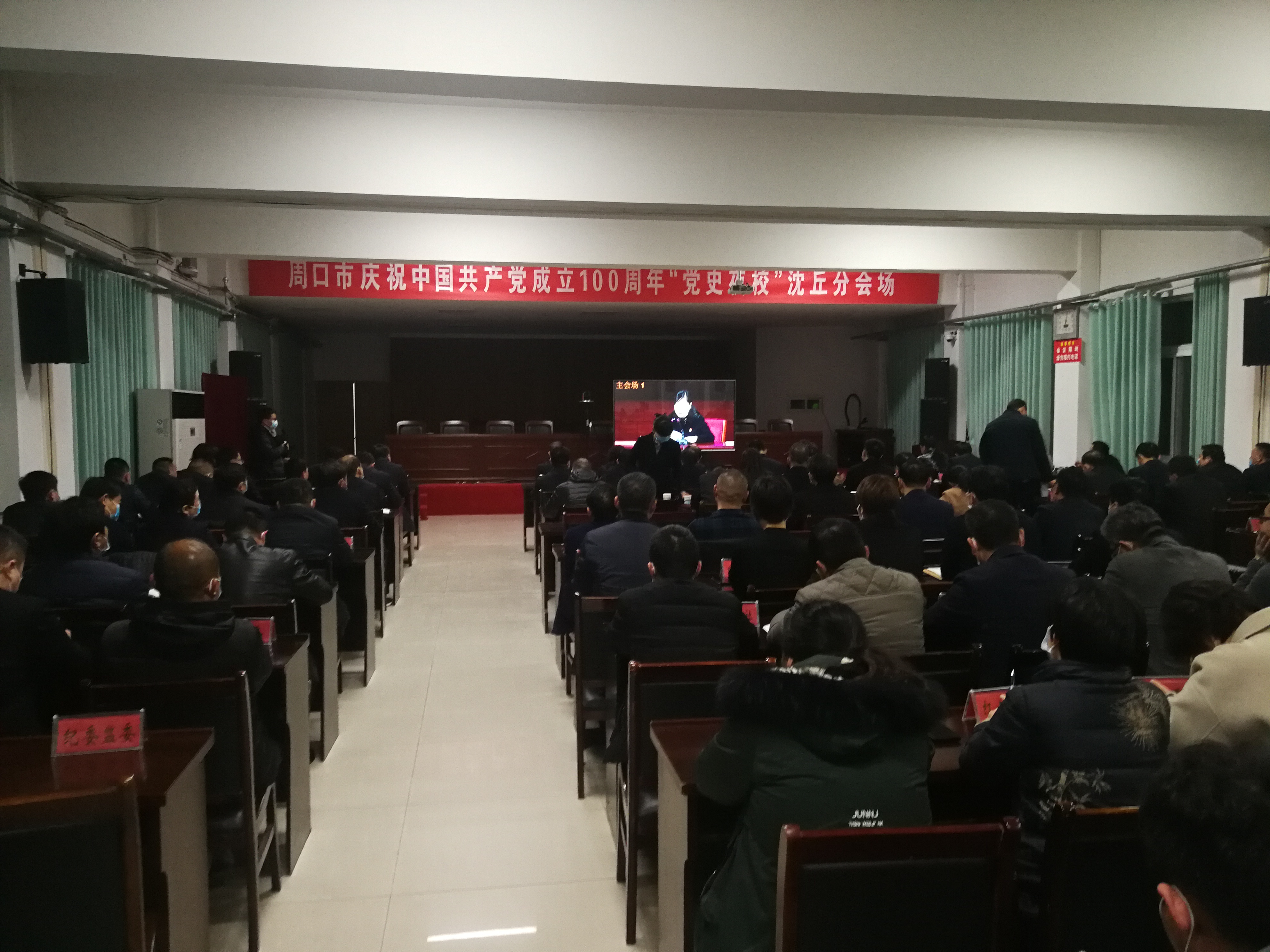 沈丘縣四個(gè)班子領(lǐng)導(dǎo)同部分黨員一起收聽(tīng)收看,仔細(xì)聽(tīng)取講課。