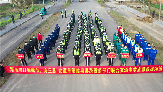 為進一步健全完善涉及危險品運輸車事故應(yīng)急處置和搶險救援機制,加強省際國省道安全管控,提高突發(fā)事件應(yīng)急處置和救援能力,經(jīng)共同研究決定,3月3日上午,河南省公安廳交警總隊組織周口市公安局交通管理支隊和安徽阜陽市公安局交通管理支隊聯(lián)合兩地交警、環(huán)保、消防、施救、120急救中心等多部門在兩市交界處舉行道路交通事故應(yīng)急救援聯(lián)合演練,演練內(nèi)容包括接處警、交通管制、環(huán)境監(jiān)測、營救被困人員、處置危化品、事故現(xiàn)場勘察、事故現(xiàn)場清理等內(nèi)容。