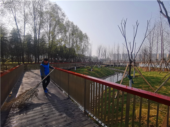 3月9日,魚(yú)翔湖曲廊環(huán)繞、新樹(shù)挺立,水面波光粼粼,不少市民漫步其中感受這水清岸綠 魚(yú)翔淺底的美景。