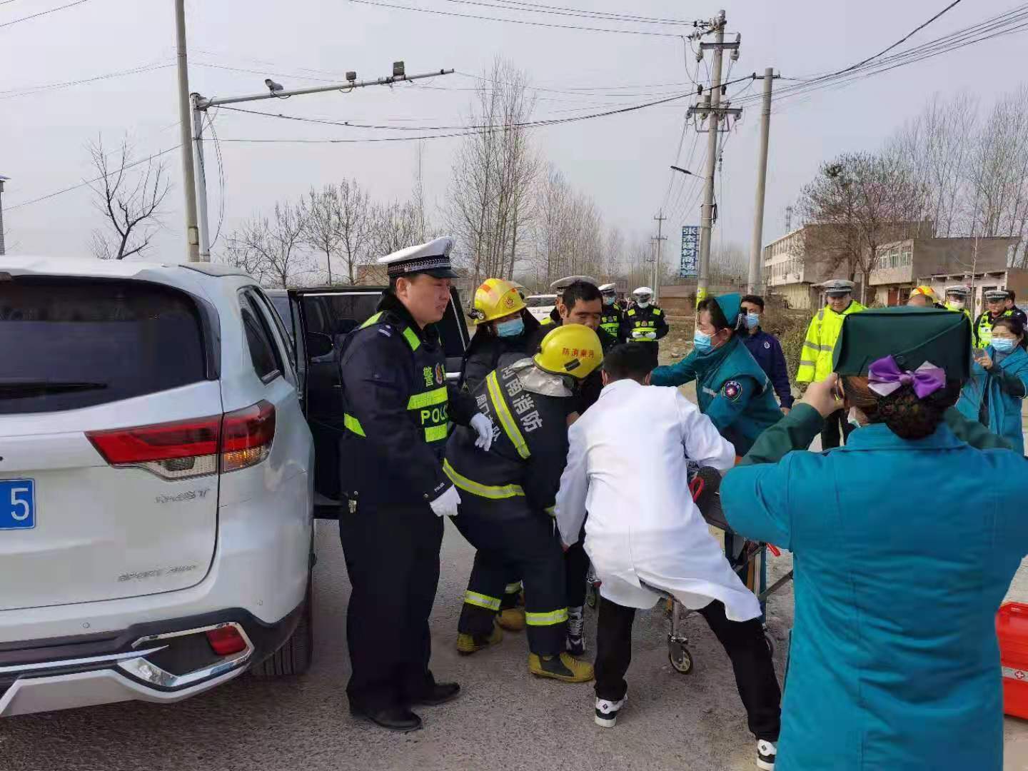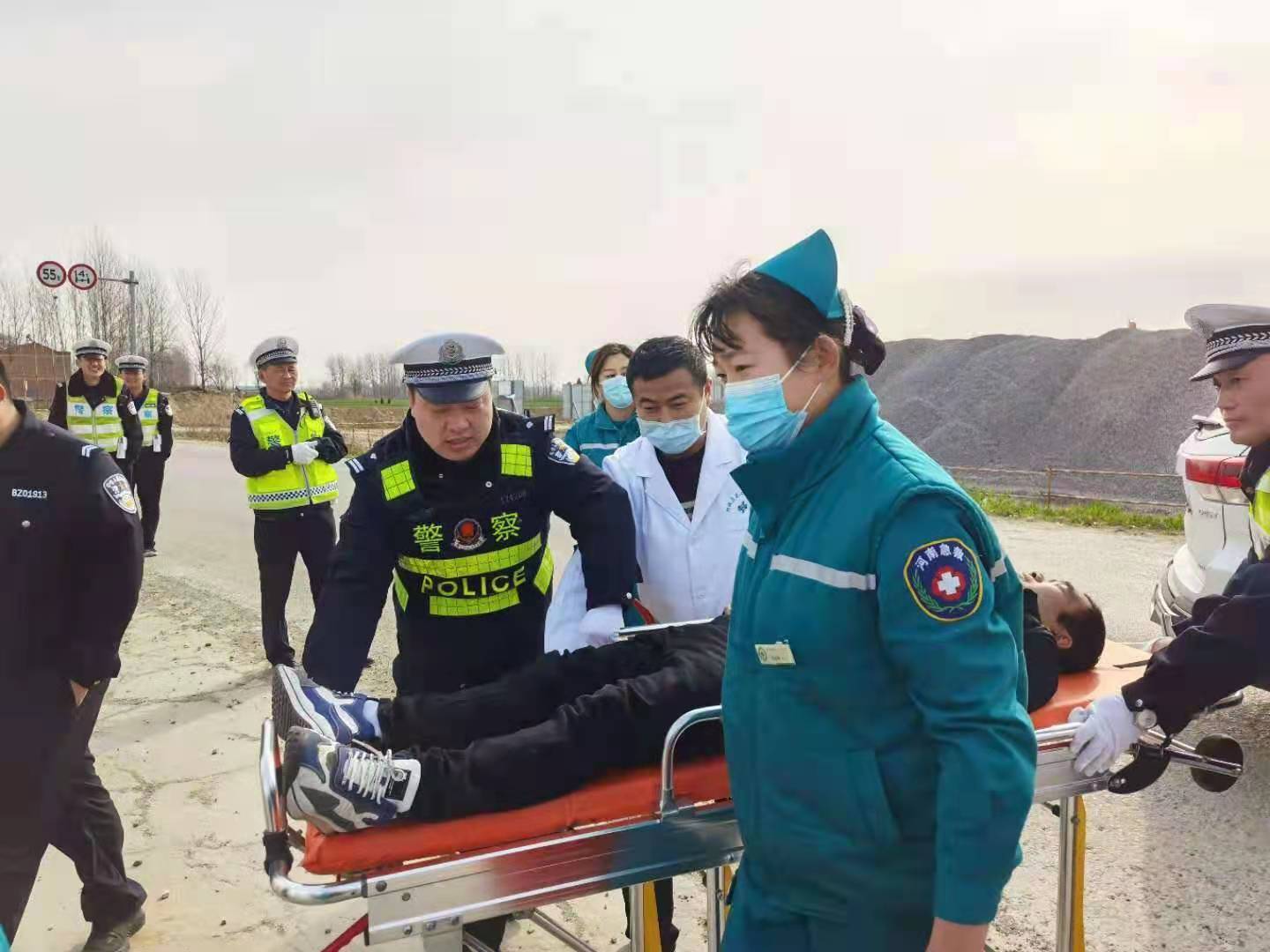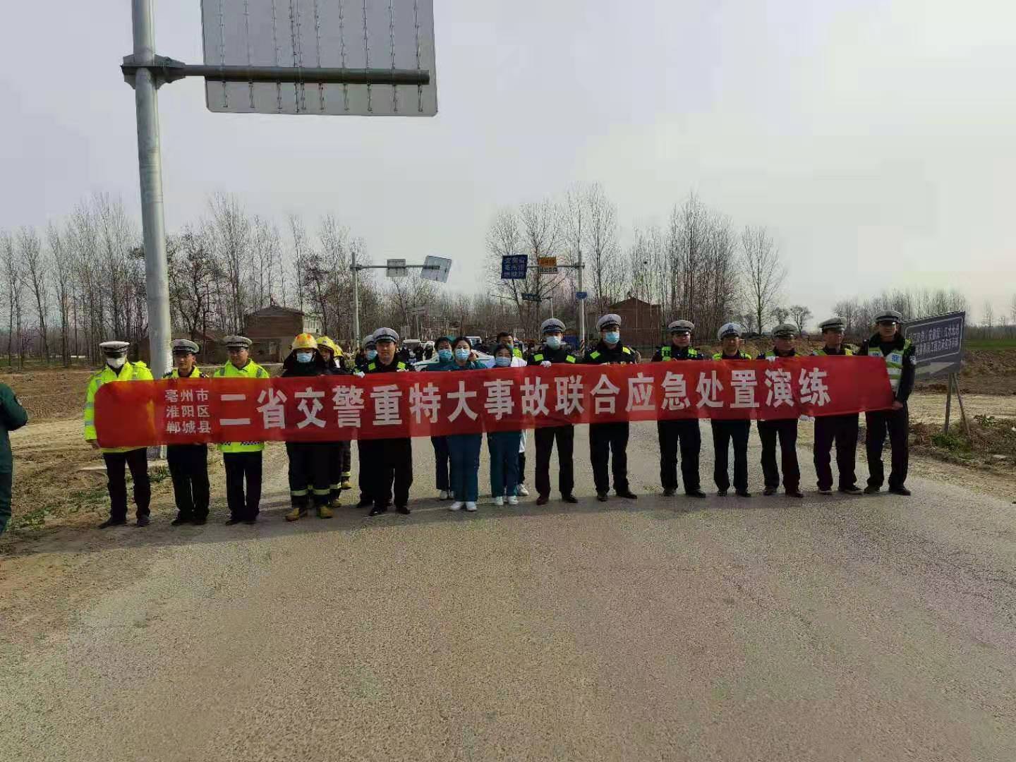 為防止和減少交通事故造成的人員傷害,檢驗(yàn)緊急情況下快速有效的聯(lián)合交通事故救援和應(yīng)急機(jī)制,3月10日上午8時(shí),河南省周口市鄲城縣交警大隊(duì)事故中隊(duì)聯(lián)系周口市淮陽(yáng)區(qū)交警大隊(duì)事故中隊(duì),鄲城縣消防應(yīng)急南豐中隊(duì),鄲城縣中心醫(yī)院與安徽省亳州市交警支隊(duì)四大隊(duì)雙溝中隊(duì)在豫皖兩省交界處,開(kāi)展惡劣天氣聯(lián)合應(yīng)急處置演練、道路中斷聯(lián)合應(yīng)急處置演練和重特大事故聯(lián)合應(yīng)急處置演練。