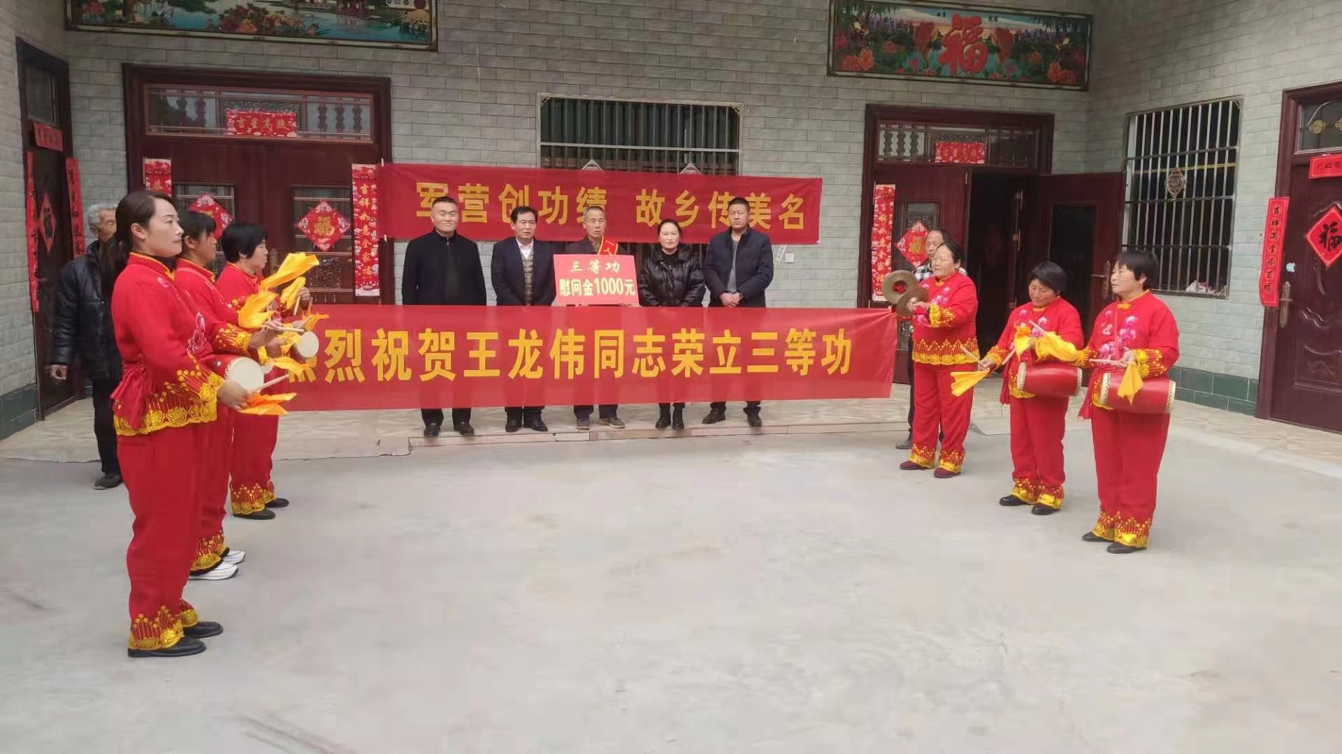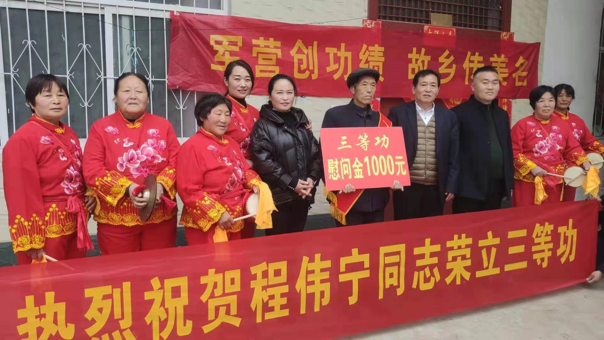 鑼鼓陣陣,喜氣盈庭。當(dāng)日伴隨著歡慶的鑼鼓聲,送喜報(bào)隊(duì)伍舉著牌匾,一路來(lái)到王龍偉、程偉寧家中,送上喜報(bào)和慰問(wèn)金。
