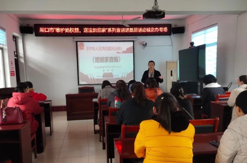 近日,我市“維護(hù)她權(quán)益 送法到你家”系列宣講活動(dòng)在川匯區(qū)城北街道辦事處舉行。駐聯(lián)絡(luò)站女人大代表、機(jī)關(guān)女干部、14個(gè)行政村(社區(qū))婦聯(lián)主席、女駐村第一書(shū)記、矛盾調(diào)解員等50多人現(xiàn)場(chǎng)聆聽(tīng)了由周口市婦聯(lián)四屆執(zhí)委、河南省明辨律師事務(wù)所執(zhí)行主任崔姝娉宣講的《民法典》之婚姻家庭編。崔姝娉以《民法典》為根本,結(jié)合實(shí)際生活中的典型案例,用風(fēng)趣幽默、通俗易懂的語(yǔ)言,生動(dòng)講解了婚姻家庭相關(guān)法律知識(shí),詳細(xì)分析了各類(lèi)案例產(chǎn)生的原因、涉及的法律問(wèn)題,進(jìn)一步解讀了《民法典》婚姻家庭編的深刻內(nèi)涵和法律要點(diǎn),與聽(tīng)眾產(chǎn)生了共鳴,現(xiàn)場(chǎng)多次響起掌聲。