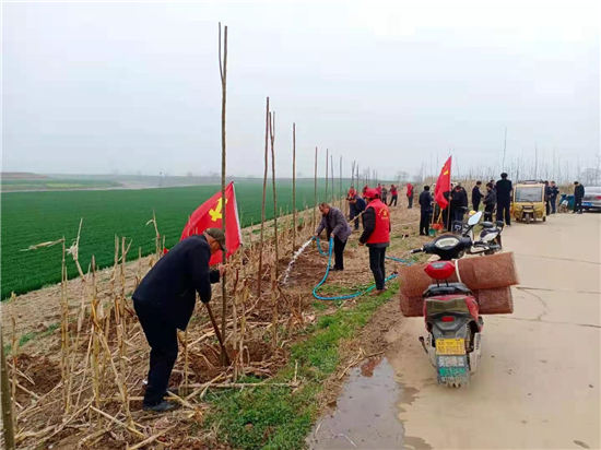 植樹現(xiàn)場,一面面鮮艷的紅色黨旗迎風飄揚,參與植樹的同志們密切配合,有人挖坑,有人運送樹苗,有人扶樹苗,有人澆水,有人封坑,一派繁忙、有序、火熱的勞動場景。
