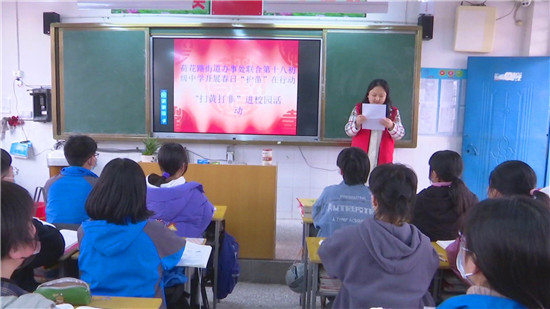 3月16日下午,川匯區(qū)荷花路街道辦事處新時代文明實踐所組織志愿者走進第十八初級中學(xué),開展春日“護苗”在行動 “掃黃打非”進校園主題教育活動。