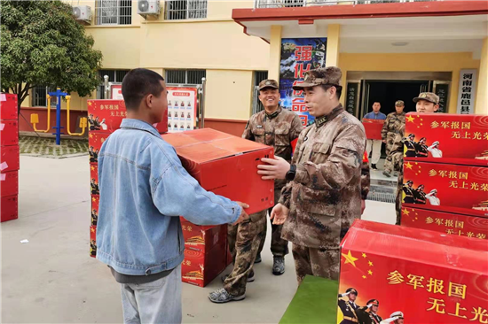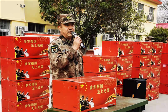 人武部主官親自為新兵發(fā)放被裝,這是鹿邑縣人武部多年來形成的一個優(yōu)良傳統(tǒng)。 為了烘托參軍入伍的喜慶氛圍,河南省軍區(qū)設計了以紅色主題的新兵被裝包裝盒,包裝盒以五星紅旗為背景,正面印著“參軍報國、無上光榮”八個大字,左下方是陸??杖妰x仗隊的標兵,整體顯得非常簡約大方、新穎喜慶。