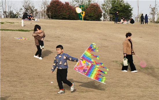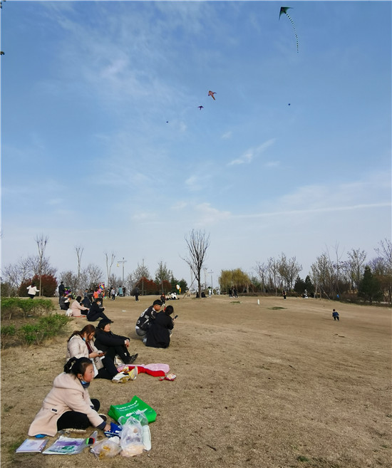 3月21日,在沙潁河南岸,明媚的春光下,不少市民攜帶家人在草坪上或放飛箏、或賞花拍照、或休閑玩耍,孩子們嬉戲奔跑著,到處是歡聲笑語(yǔ)。