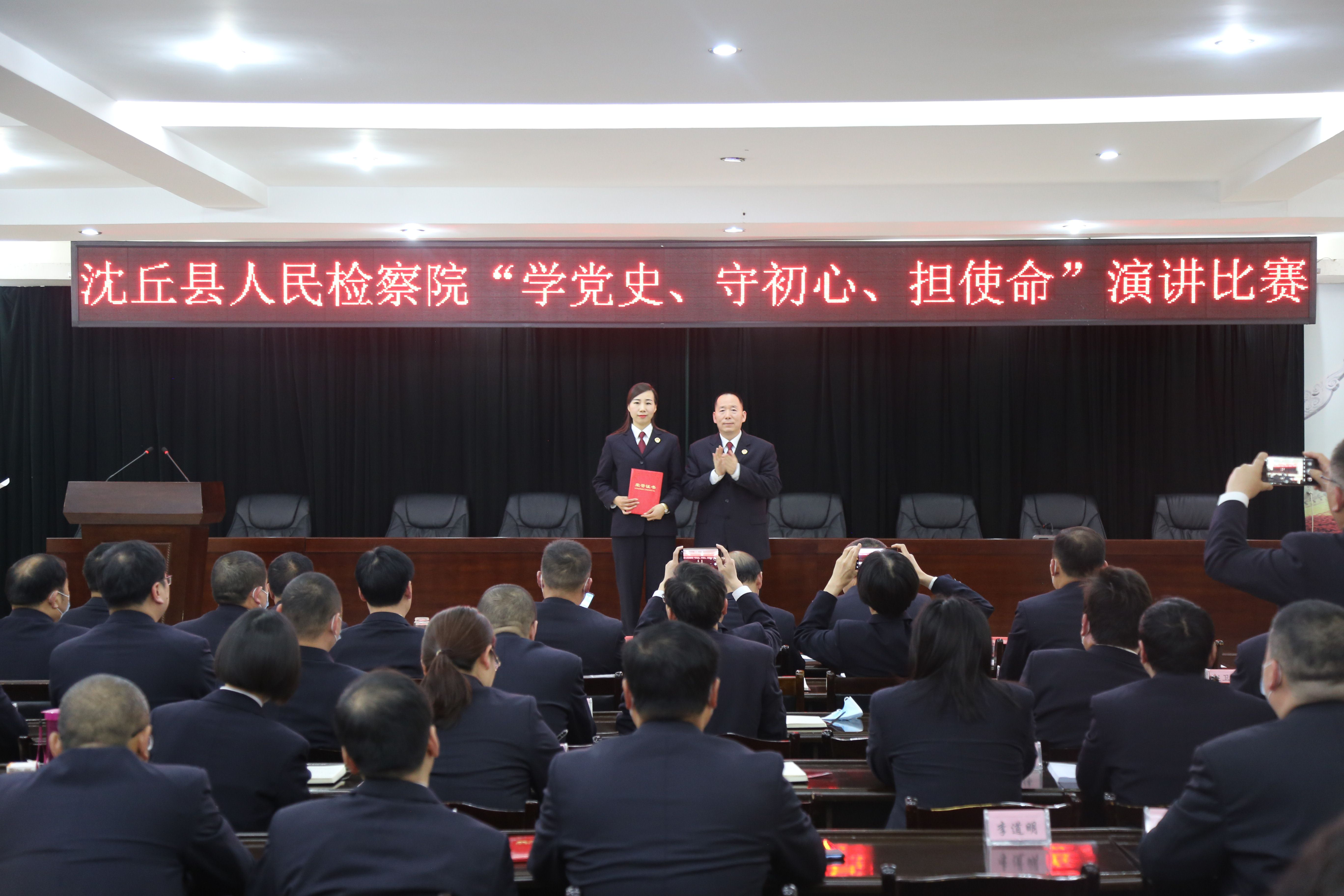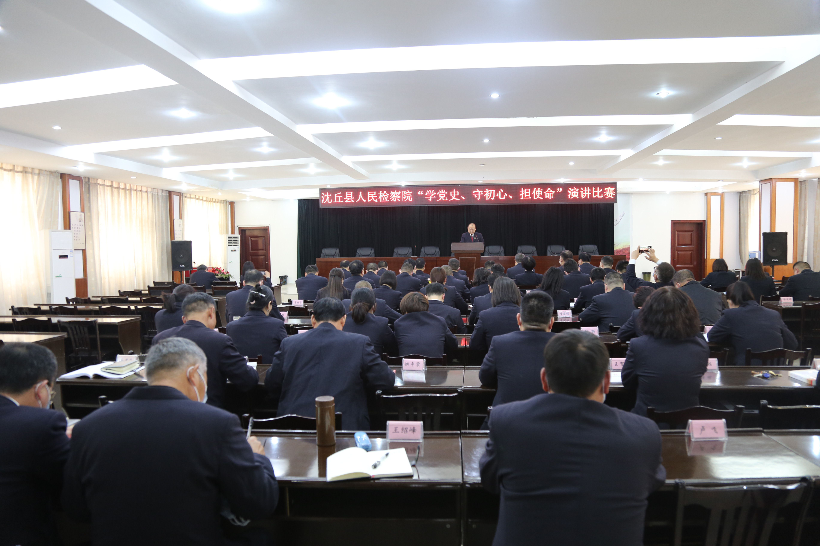 為進(jìn)一步深化全體干警對政法隊伍教育整頓工作重要性的認(rèn)識,進(jìn)一步激發(fā)干警參與教育整頓的積極性和主動性,3月23日下午,沈丘縣人民檢察院開展了“學(xué)黨史、守初心、擔(dān)使命”政法隊伍教育整頓主題演講比賽,沈丘縣人民檢察院黨組書記、檢察長李世龍帶領(lǐng)院領(lǐng)導(dǎo)班子成員擔(dān)任評委,黨組副書記、副檢察長作了賽前講話,比賽由黨組成員、政治部主任胡新建主持。