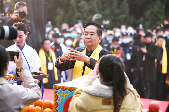 祭祀現(xiàn)場的長條桌上擺著水果和五谷,祭祀活動按照傳統(tǒng)禮儀進(jìn)行,在莊嚴(yán)的古樂及禮炮聲中,先由身著古裝的群體祭祀者以古老禮俗進(jìn)行祭拜,而后進(jìn)行獻(xiàn)爵、恭讀祭文,隨后參加祭祀活動的社會各界代表獻(xiàn)上花籃,依次祭拜,表達(dá)對我們一代先哲的緬懷。