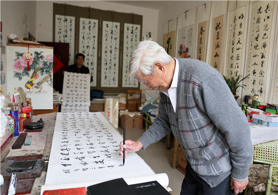 眼下,他正在苦練創(chuàng)作習(xí)近平總書記有關(guān)黨史學(xué)習(xí)教育活動的講話,他精心收藏并抄錄的10米長卷即將完成。還有,“千歌萬曲頌黨恩浩蕩,濃墨重彩書華夏風流”等數(shù)十副對聯(lián),有的捐給了書協(xié)、有的贈送給友人、有的留在了展覽館、有的自己收藏。為建黨100周年獻上了一位癡書、愛國、愛黨的老人心意。
