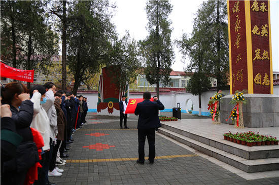 鄲城縣自然資源局黨員干部在紀念碑前重溫入黨誓詞。