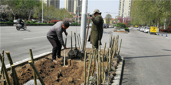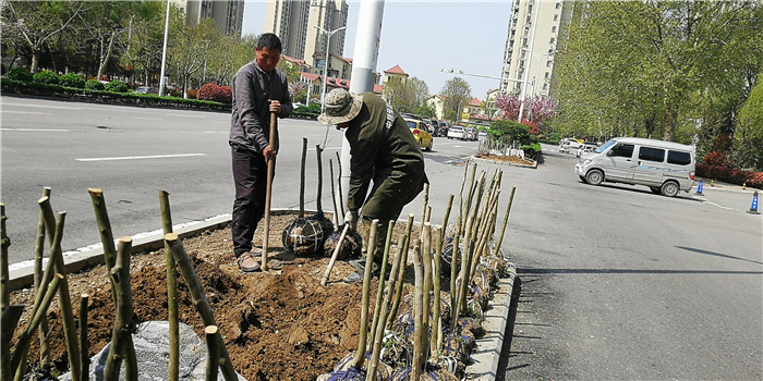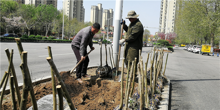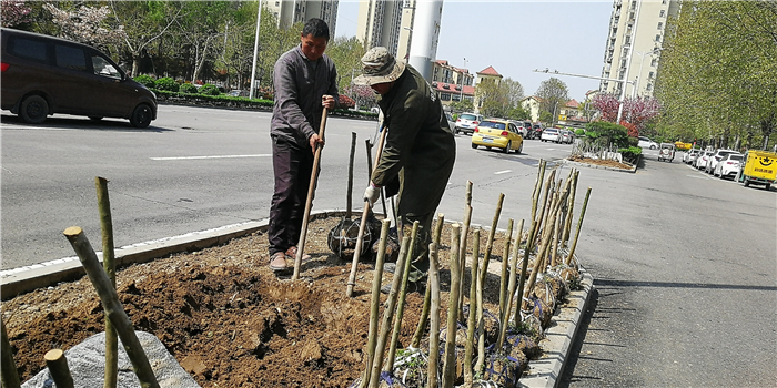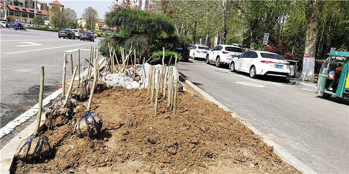 仲春時(shí)節(jié),我市積極打造街頭游園、口袋公園,增加市民休閑游樂場所。圖為園林工人正在施工。②7