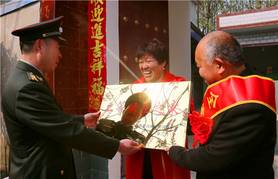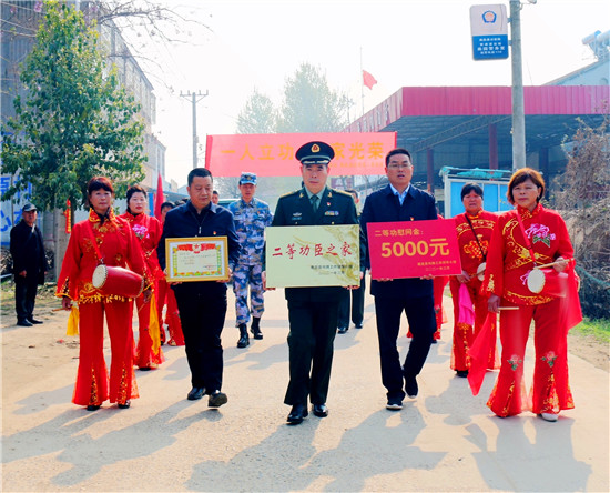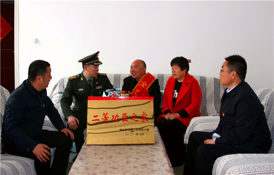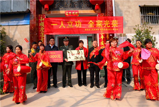 李峰說:“一張立功喜報,不僅是軍人榮譽的象征、成長進步的見證,也承載著軍人家屬的期盼與慰藉。功臣是實現(xiàn)強軍興軍目標的尖兵,他們在部隊建功立業(yè),我們力所能及服務(wù)保障好他們的家人,積極在全社會營造起‘功臣受愛戴、軍人受尊崇、軍屬受尊敬’的氛圍。”為此,鹿邑縣人武部積極構(gòu)建軍人軍屬榮譽體系,每逢重大節(jié)日,都要協(xié)調(diào)地方黨委、政府開展為現(xiàn)役軍人和軍屬送喜報,掛功臣匾、光榮牌等活動,通過活動激勵等形式,讓軍人軍屬享有更多的“專屬榮光”,努力營造“一人參軍,全家光榮;一人立功,全村光榮”的濃厚氛圍,更加堅定了軍屬支持子女獻身國防的決心,進一步激發(fā)了鹿邑籍官兵獻身軍營、報效祖國的積極性。②9