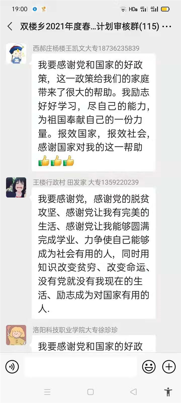 “感謝幫助過我家的所有幫扶人,沒有你們,就沒有我家今天的幸福生活,我們光榮脫貧了,作為貧困家庭中新成長勞動力,我一定珍惜這次來之不易的學習機會,好好學習技術,畢業(yè)后回村成為一名技術帶頭人,來促進家鄉(xiāng)產(chǎn)業(yè)的發(fā)展?!编惓强h雙樓鄉(xiāng)孫莊村脫貧學生張素華在微信群里說。近幾天,鄲城縣雙樓鄉(xiāng)114人的大學生微信群里可熱鬧了,在鄉(xiāng)黨委政府的引導下,該鄉(xiāng)眾多脫貧后的大學生通過鄉(xiāng)里建起的微信群,紛紛圍繞“話脫貧、感黨恩、奮進新時代”這一主題交流思想,提振斗志。