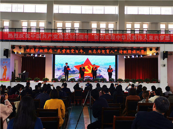 進(jìn)修學(xué)校吳敵等4位教師朗誦的《七月贊歌》,贏得了在場觀眾一陣又一陣?yán)坐Q般的掌聲,將整場比賽推向了高潮。蓮溪中學(xué)兩位教師朗誦的《我的芳華,獻(xiàn)給黨》,抒發(fā)了對黨百年華誕的祝福,也讓我們看到了教體人的風(fēng)采。