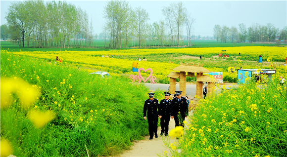 4月10日上午,商水縣公安局組織民警在鄧城鎮(zhèn)6000多畝油菜花海中執(zhí)勤巡邏,疏導(dǎo)交通,確保游客安全。當(dāng)日,商水縣首屆金色花田樂(lè)游匯暨農(nóng)特產(chǎn)品展銷(xiāo)會(huì)開(kāi)幕式在此舉行。來(lái)自市內(nèi)外的數(shù)萬(wàn)名游客到這里踏青賞春。