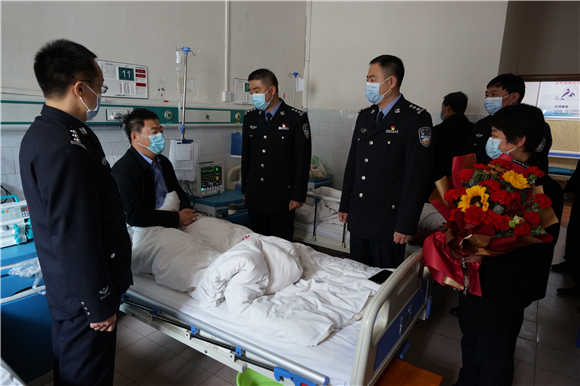 4月9日上午,項城市副市長、公安局黨委書記、局長萬東偉同志專程前往項城市第一人民醫(yī)院,看望慰問累倒在工作崗位上的刑偵大隊民警李書金,為其送去鮮花和慰問金。局黨委副書記、副局長陳重,黨委委員、副局長張勛峰,黨委委員王濟嶺、衛(wèi)偉等陪同慰問。