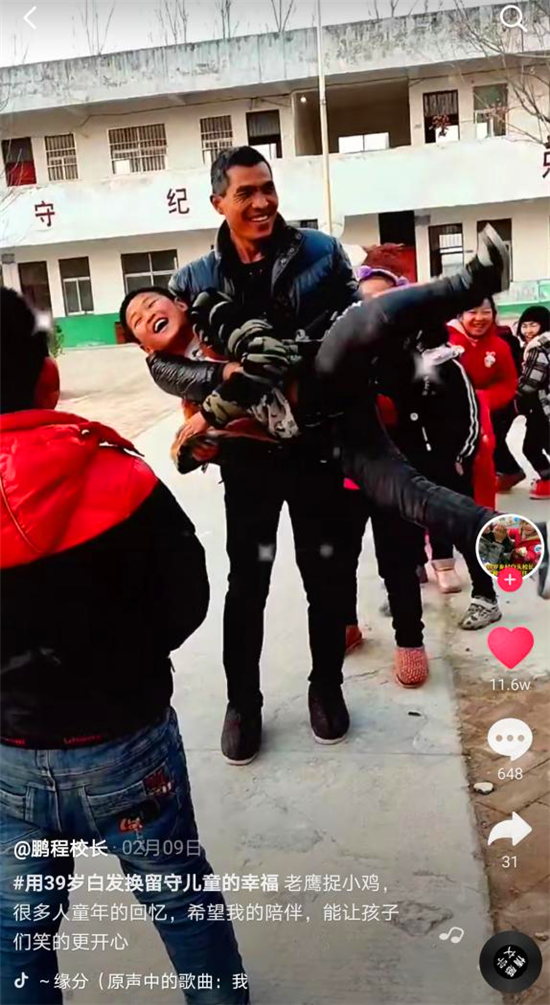 上一次“走紅”,是今年2月9日。鵬程校長在抖音發(fā)布“用39歲白發(fā)換留守兒童幸?!币曨l登上熱榜。視頻中,張鵬程和小學(xué)孩子們玩老鷹捉小雞的游戲,引來11.6萬點(diǎn)贊。