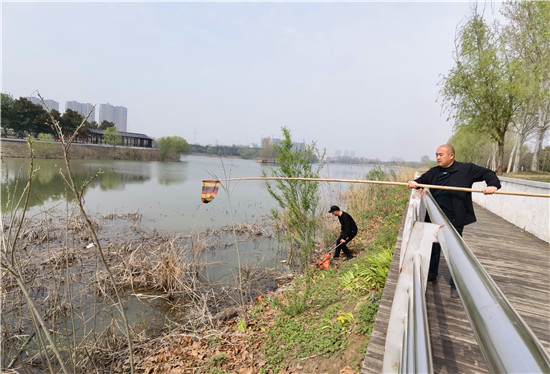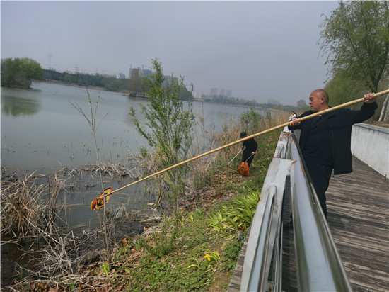 4月16日,周口植物園管理人員及保潔人員在打撈漂浮在湖水中的垃圾及枯草。為了給市民提供一個(gè)干凈、優(yōu)美的園內(nèi)環(huán)境,植物園的工作人員每天都會清理打撈湖水中的雜物。