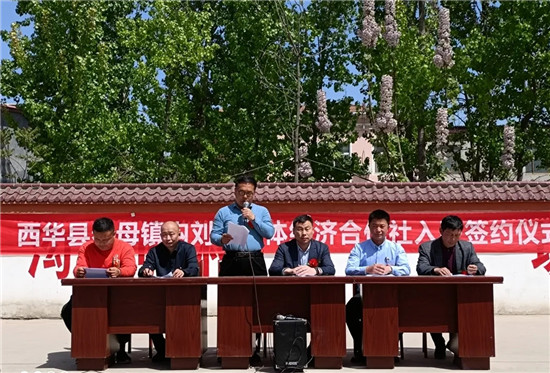 4月17日,西華縣奉母鎮(zhèn)溝劉村文化廣場上載歌載舞,機器聲隆隆,溝劉村、前于王村、鐵佛寺村、溝東村四村集體經(jīng)濟合作社聯(lián)合入股簽約儀式在這里隆重舉行。該鎮(zhèn)黨委副書記、鎮(zhèn)長馬克強,主任科員程聯(lián)合,黨委委員郭金磊及四個股東村“三委”干部、社員100余人參加簽約儀式,程聯(lián)合主持簽約儀式。