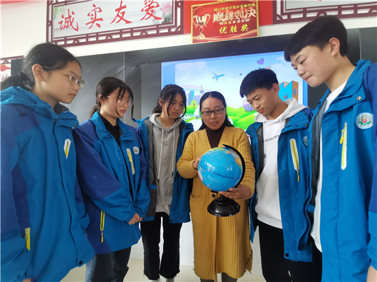 周口經(jīng)濟(jì)開(kāi)發(fā)區(qū)實(shí)驗(yàn)學(xué)校教師為學(xué)生講解地球結(jié)構(gòu)知識(shí)。
