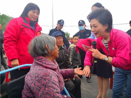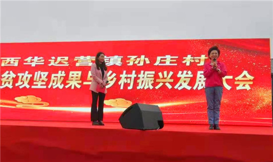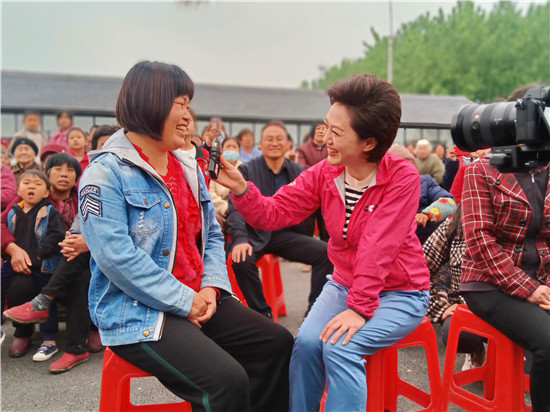 (圖片說明:央視主持人海霞登臺(tái)向?qū)O莊村群眾問好)