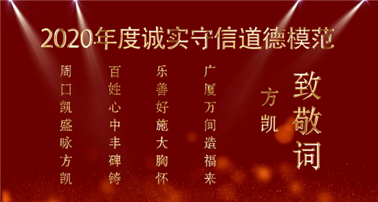 “廣廈萬間造福來,樂善好施大胸懷;百姓心中豐碑筑,周口凱盛詠方凱?!被顒咏M委會在授予方凱的致敬詞中這樣說道。
