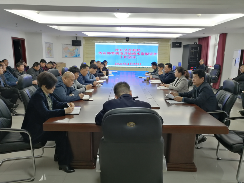 4月25日,沈丘縣水利局召開機電井維修水資源管護專題工作會議,局機關全體人員、局屬相關二級機構人員參加會議。