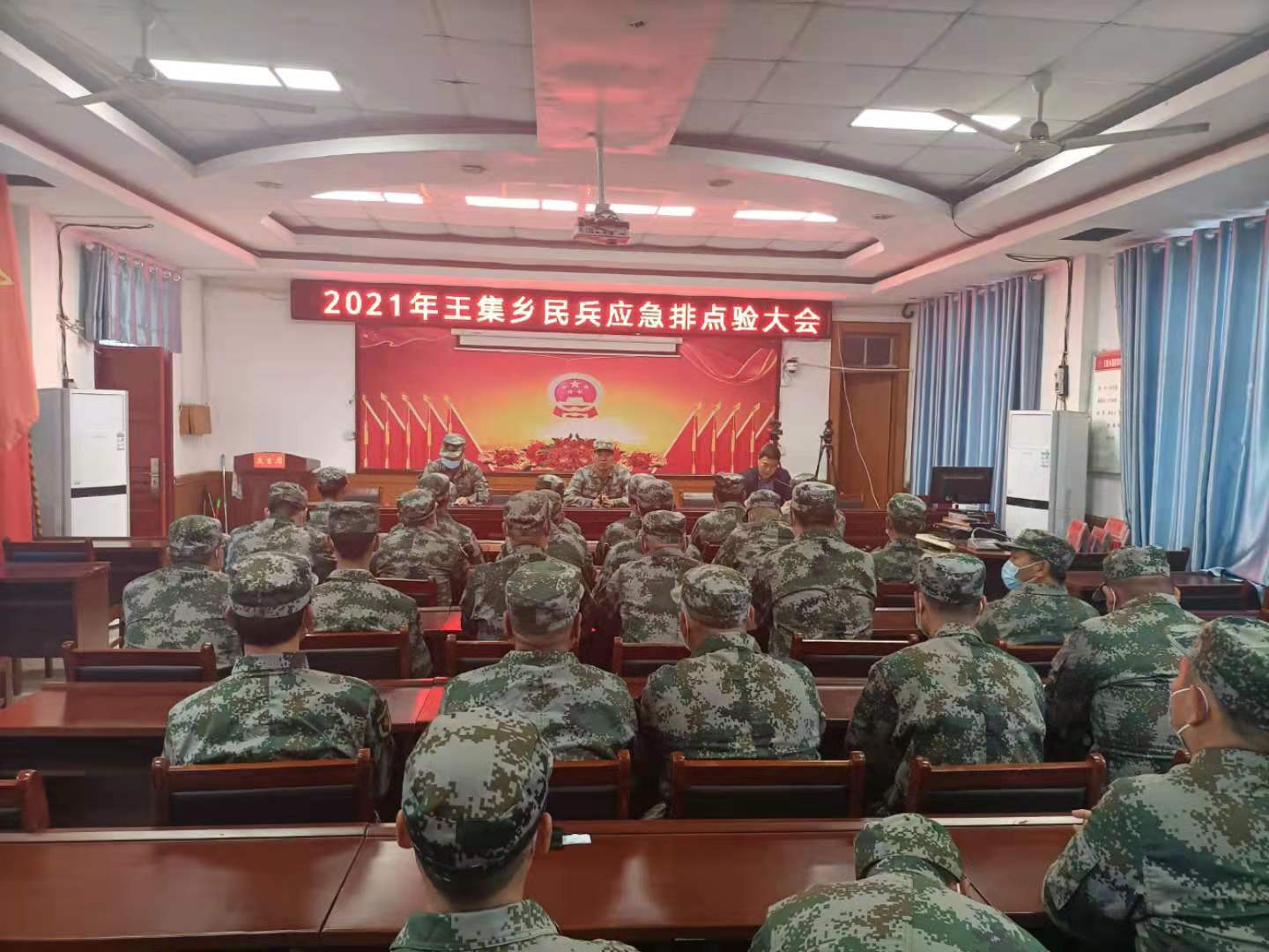 當(dāng)日下午4時30分,基干民兵點驗大會開始。全體起立,奏唱《中國人民解放軍軍歌》,接著,應(yīng)建輝宣讀了民兵干部任職命令,王軍輝代表新入隊民兵發(fā)言并帶領(lǐng)全隊入隊宣誓。于永前對該鄉(xiāng)基干民兵良好的政治素養(yǎng)和飽滿的精神風(fēng)貌給予了高度的肯定,并提出民兵應(yīng)急排是戰(zhàn)時應(yīng)戰(zhàn)的保障需求、是急時應(yīng)急的關(guān)鍵舉措、是平時服務(wù)的現(xiàn)實需求,要求民兵在全面建成小康社會、鄉(xiāng)村建設(shè)、搶險救災(zāi)和維護(hù)社會穩(wěn)定等工作中充分發(fā)揮突擊隊和生力軍作用。他要求全體民兵要肩負(fù)起使命,扛起責(zé)任,振奮精神,練好本領(lǐng),希望以這次點驗大會為契機(jī),開創(chuàng)王集鄉(xiāng)民兵工作新局面。