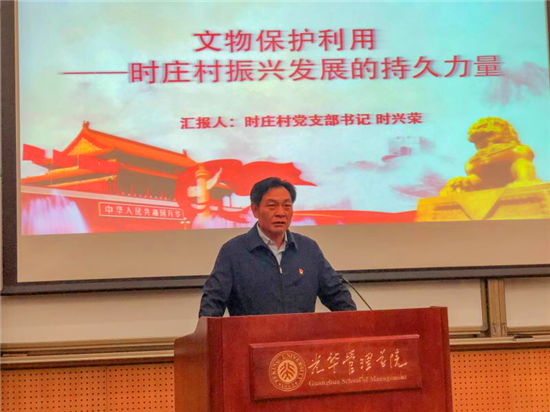 時(shí)興榮以“文物保護(hù)利用——時(shí)莊村振興發(fā)展的持久力量”為題發(fā)言。從四個(gè)方面闡述了時(shí)莊村在糧倉(cāng)遺址的文物發(fā)掘、保護(hù)、利用中的故事。時(shí)興榮說(shuō),鄉(xiāng)村干部要有“大象肚子、兔子腿,還要長(zhǎng)個(gè)八哥嘴”,即能容人容事,為村民辦事要手勤、腳勤,調(diào)解矛盾、宣傳政策要以文化人,想群眾之所想。黨員心里有初心,黨的形象不受損,支部心里有群眾,群眾永遠(yuǎn)跟黨走。在他的帶領(lǐng)下,時(shí)莊村致力于發(fā)揮好、保護(hù)好、利用好考古文物發(fā)掘的機(jī)遇,轉(zhuǎn)變思想觀念,將文物發(fā)掘、文物保護(hù)、文物利用作為時(shí)莊村各項(xiàng)事業(yè)開(kāi)展的重心,為時(shí)莊村未來(lái)的發(fā)展厘清思路、定準(zhǔn)方向。他的演講引來(lái)在場(chǎng)北京大學(xué)學(xué)生的陣陣掌聲。