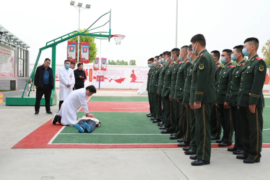 急診科醫(yī)師劉洋現(xiàn)場為官兵們進(jìn)行了心肺復(fù)蘇急救演示,手把手教給官兵如何進(jìn)行急救,武警戰(zhàn)士們?cè)卺t(yī)生的指導(dǎo)下,認(rèn)真反復(fù)演練。