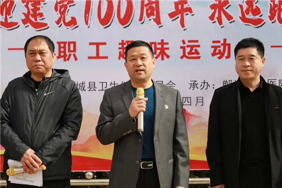 為慶祝中國共產(chǎn)黨建黨100周年,豐富職工精神文化生活和業(yè)余生活,進(jìn)一步開展全民健身活動(dòng),增強(qiáng)干部職工身體素質(zhì),展示廣大干部職工團(tuán)結(jié)拼搏的精神風(fēng)貌。4月29日,由鄲城縣衛(wèi)健委主辦,鄲城縣中醫(yī)院承辦的“喜迎建黨100周年 永遠(yuǎn)跟黨走”職工趣味運(yùn)動(dòng)會(huì)在縣衛(wèi)健委舉行。縣衛(wèi)健委黨組書記、主任付登霄,縣總工會(huì)副主席王滿倉,縣衛(wèi)健委副主任徐濤、劉清俊、肖儉,副科級(jí)干部王曉琳,縣第二醫(yī)療健康服務(wù)集團(tuán)縣中醫(yī)院院長水新華出席運(yùn)動(dòng)會(huì)。由縣衛(wèi)健委、縣第二醫(yī)療健康服務(wù)集團(tuán)總部及所屬醫(yī)共體單位組成的8個(gè)代表隊(duì)歡聚一堂,共享運(yùn)動(dòng)競技的快樂。