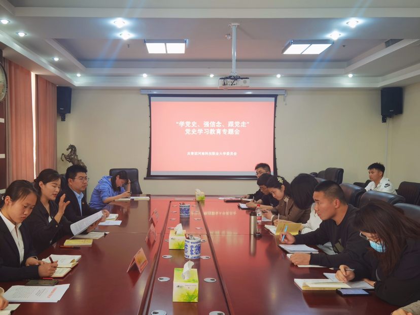 為認(rèn)真貫徹習(xí)近平總書記在黨史學(xué)習(xí)教育動(dòng)員大會(huì)上的重要講話精神,引領(lǐng)廣大黨員深入學(xué)習(xí)黨的歷史,深化青年厚植愛黨、愛國(guó)、愛社會(huì)主義的情感,4月29日,共青團(tuán)河南科技職業(yè)大學(xué)委員會(huì)召開“學(xué)黨史、強(qiáng)信念、跟黨走"黨史學(xué)習(xí)教育專題會(huì)。