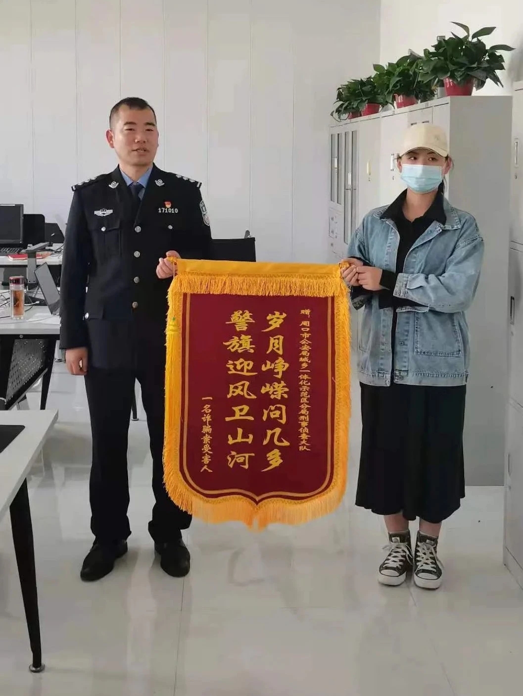 周口日報·周道客戶端記者 侯國防記者從周口市公安局獲悉,貴州男子魏某利用周口一高校女生心思單純,騙取其6000多元。近期,周口市公安局示范區(qū)分局通過積極工作,南下貴州,在當?shù)鼐街С峙浜舷?,成功將犯罪嫌疑人魏某抓獲,并追回該女生被騙的錢財,為受害人挽回了經(jīng)濟損失。受害人為此特意贈送一面錦旗表示感謝。