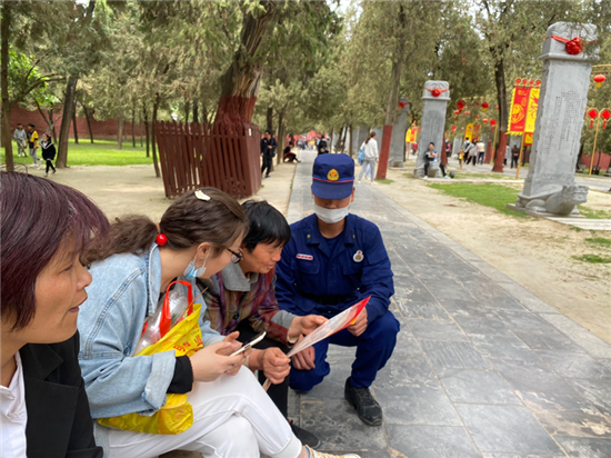 “旅游快樂每一天,消防安全得優(yōu)先;煙頭不能隨便丟,防火常識心中留?!?月1日,在太昊陵景區(qū),消防人員向游客發(fā)放防火宣傳單,得到了游客廣泛點(diǎn)贊。消防人員針對景區(qū)防火實(shí)際,向游客大力宣講各類消防安全知識,倡議游客主動上交打火機(jī)等各類火種,在景區(qū)內(nèi)各類防火宣傳提示也是隨處可見。②5