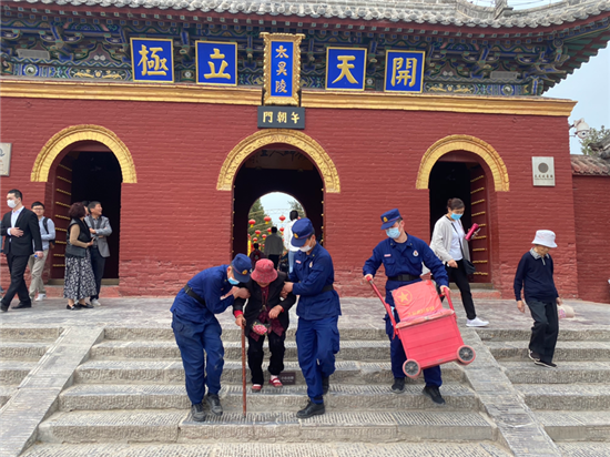 統(tǒng)天殿前一名老人步履蹣跚,正在殿前廣場巡檢的前置執(zhí)勤點(diǎn)消防人員迅速向前,接過手提袋,小心翼翼地攙扶老人走上臺階跨過門檻……而這,僅僅是“五一”假期太昊陵景區(qū)消防人員緊急幫助游客的一個場景。在各景區(qū),隨處可見“火焰藍(lán)”的身影,他們堅守一線執(zhí)勤崗位,疏導(dǎo)人流、定點(diǎn)警戒,想群眾之所想、急群眾之所急,舍小家為大家。