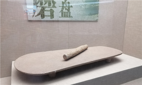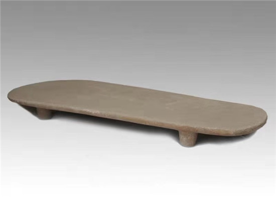仔細(xì)端詳這臺(tái)石磨盤(pán),你會(huì)發(fā)現(xiàn)它的做工竟如此規(guī)整:由整塊黃砂巖磨制而成,長(zhǎng)100厘米,大頭寬44厘米,小頭寬22厘米,厚3.5厘米,表面平坦,沒(méi)有任何凹陷痕跡;兩邊呈直線,四角略呈弧形,底部也很平整,還有4個(gè)圓柱狀、支撐用的足,足長(zhǎng)5厘米左右。試想,在當(dāng)時(shí)生產(chǎn)工具極度落后的時(shí)期,要制作如此大而規(guī)整的一個(gè)石磨盤(pán),需要耗費(fèi)多么大的勞動(dòng)量,需要花上多少年的時(shí)間,才能打磨出這么平坦光致的效果?也正因如此,石磨盤(pán)成為當(dāng)時(shí)先民的貴重財(cái)產(chǎn)。