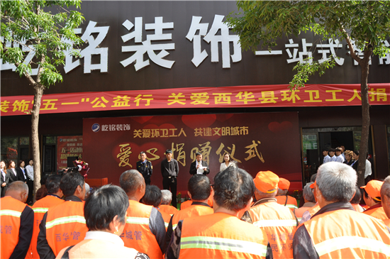 “五一”前夕,河南屹銘裝飾工程有限公司舉行了“五一”公益行·關(guān)愛環(huán)衛(wèi)工人捐贈儀式,向環(huán)衛(wèi)工人捐贈服裝、手套及礦泉水等物品。