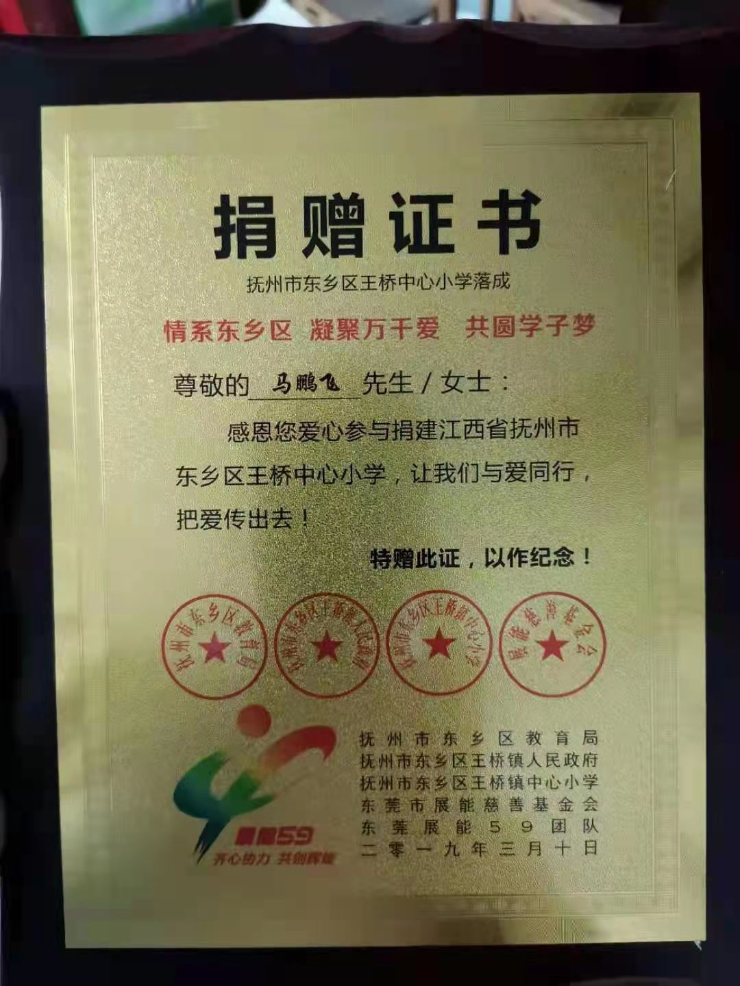 2019年,馬鵬飛出資數(shù)萬元,參與捐建了江西省撫州市東鄉(xiāng)區(qū)王橋中心小學(xué),凝聚愛心,共圓老區(qū)學(xué)子夢。3月,撫州市東鄉(xiāng)區(qū)教育局、撫州市東鄉(xiāng)區(qū)王橋鎮(zhèn)人民政府、王橋鎮(zhèn)中心小學(xué),為馬鵬飛頒發(fā)了捐建證書。