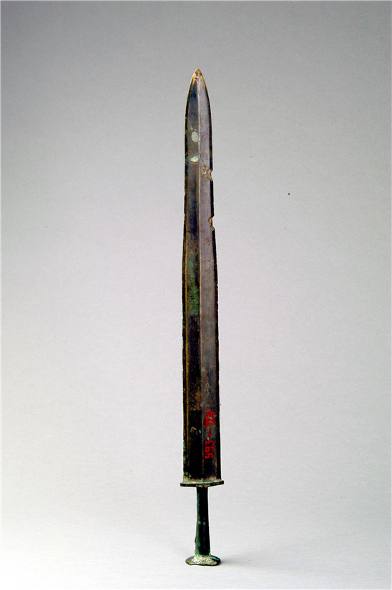劍,古代冷兵器,屬于“短兵”,乃是兵中王者,被稱為“百兵之君”。開雙刃身直頭尖,橫豎可傷人,擊刺可透甲,兇險異常,生而為殺。也用以佩帶,以顯示貴族的身份地位。青銅劍,一般是銅、錫合金冶煉鑄造而成的,商周時期開始出現(xiàn),春秋戰(zhàn)國時期達(dá)到頂峰,一直延續(xù)到秦漢,隨著鐵劍的出現(xiàn)才銷聲匿跡。越王劍,本是越王所鑄之劍,也可用于賞賜和饋贈。